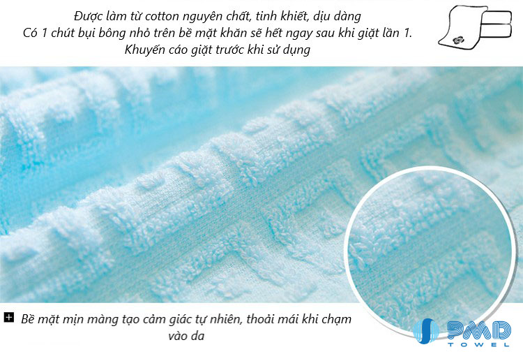 ♣ Khăn tuyệt đối không bị đổ lông,sổ lông, hay bụi bông, không bị hôi hay khô cứng, hoàn toàn không gây mẫn cảm với da, có khả năng kháng khuẩn cao,chống được nấm mốc. Khăn cotton cao cấp PMĐ an toàn cho da, tạo cảm giác thoải mái cho người sử dụng
