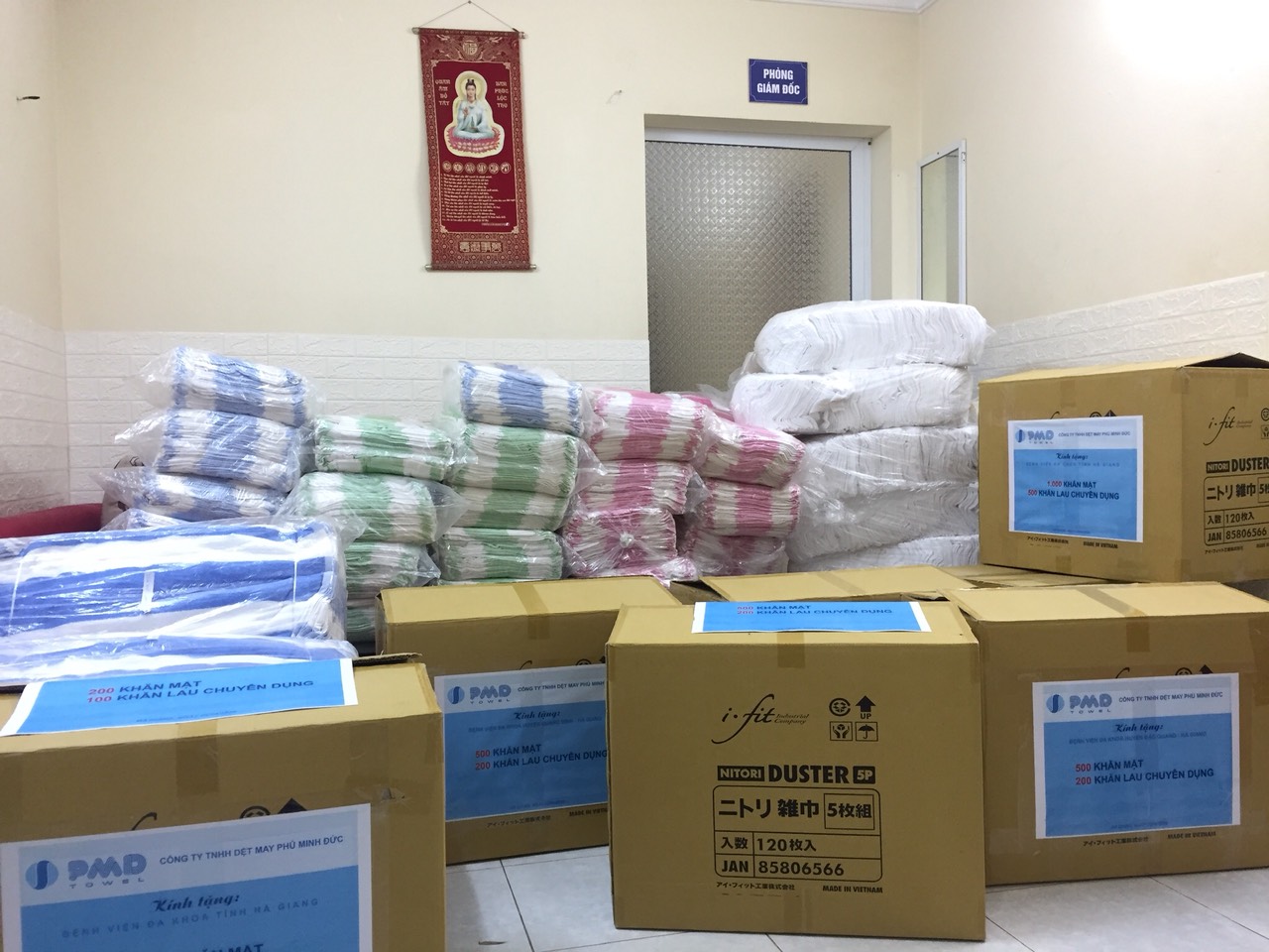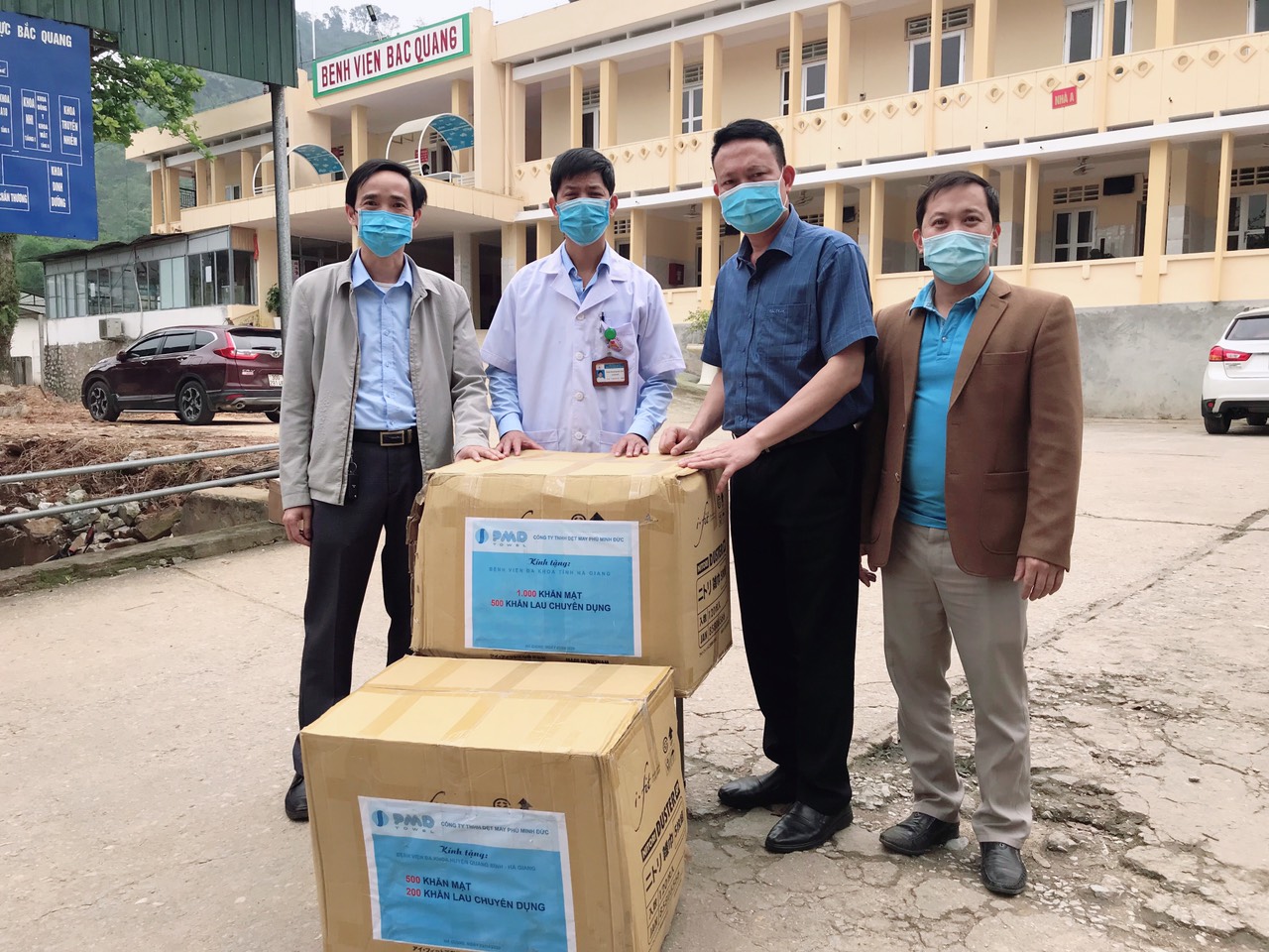 Toàn bộ số khăn 3.200 chiếc được ban Giám đốc công ty Phú Minh Đức trao tận tay cho tuyến BV đa khoa tỉnh Hà Giang, Bv đa khoa huyện Bắc Quang, Bv đa khoa huyện Quang Bình, Khu cách ly Thanh Thủy, Vị Xuyên, Hà Giang