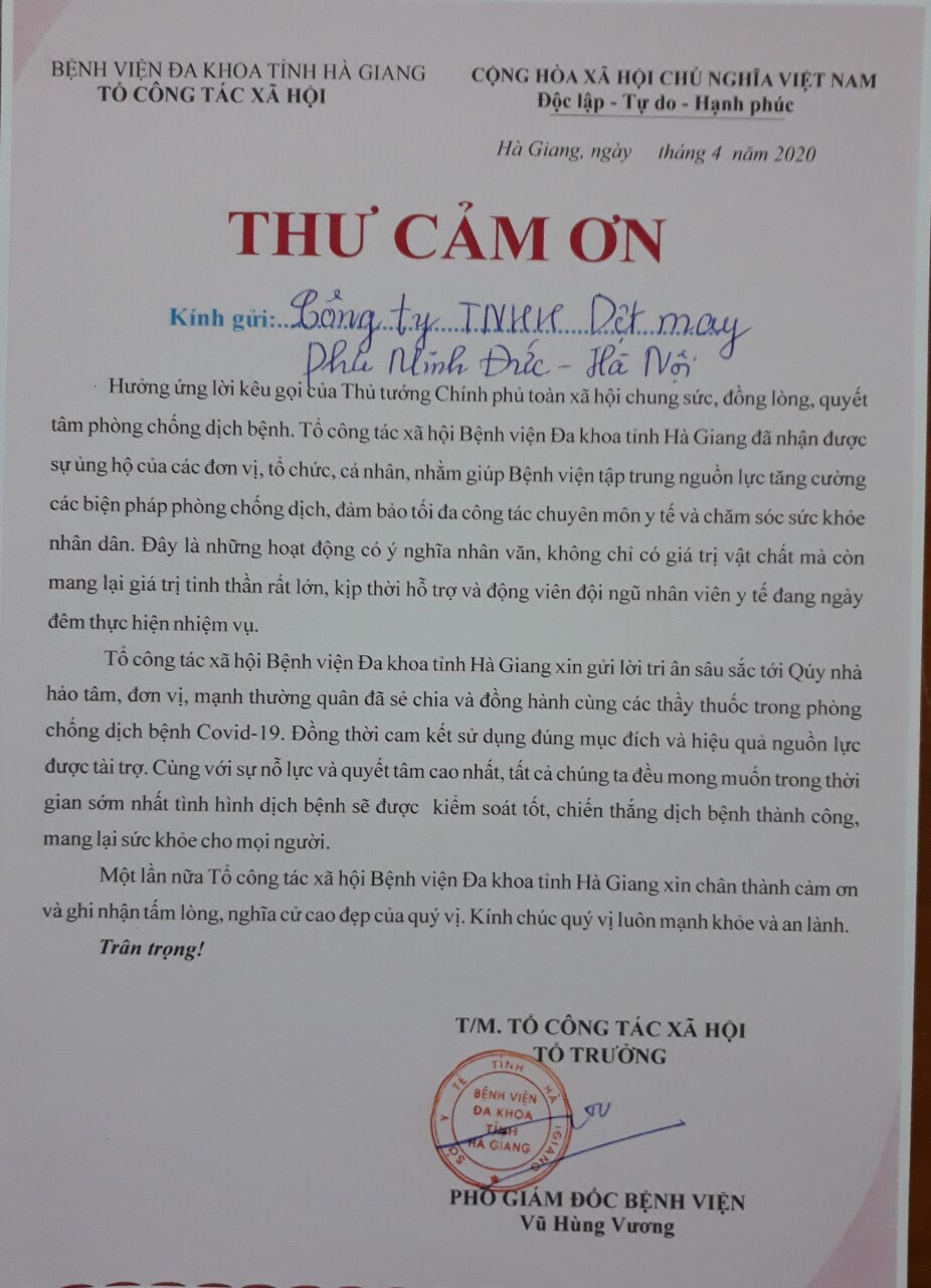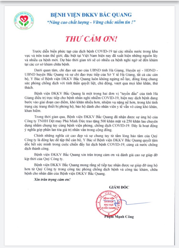 Công ty TNHH Dệt May Phú Minh Đức xin tri ân các Y Bác sỹ tuyến Bv Hà Giang, tri ân các cán bộ khu cách ly cùng toàn thể bệnh nhân, đồng bào nghèo vùng địa đầu Tổ quốc đã đón nhận và trân trọng món quà từ Công ty.